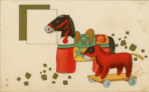 さまざまなテイストで描かれた馬のイラストのほか、子どもの日常生活や遊びをモチーフにした年賀絵はがきが目を引きます。干支にちなんだ意匠には馬の背に乗った子、竹馬で遊ぶ子、中には器械体操の“あん馬”に挑戦している男の子まで。馬や日本の子どもたちと戯れている、さまざまな装いのキューピーにもぜひご注目を。“カカア天下”な夫婦を面白おかしく描写した風刺画シリーズなど、ユーモアにあふれた漫画タッチの年賀状もご紹介しています。