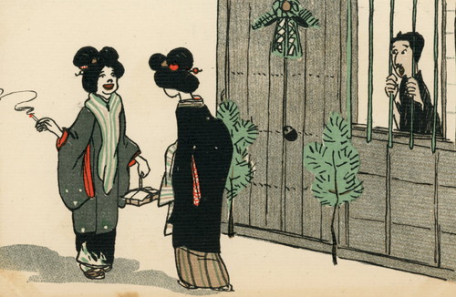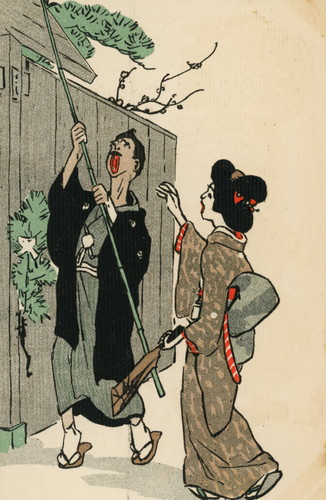 さまざまなテイストで描かれた馬のイラストのほか、子どもの日常生活や遊びをモチーフにした年賀絵はがきが目を引きます。干支にちなんだ意匠には馬の背に乗った子、竹馬で遊ぶ子、中には器械体操の“あん馬”に挑戦している男の子まで。馬や日本の子どもたちと戯れている、さまざまな装いのキューピーにもぜひご注目を。“カカア天下”な夫婦を面白おかしく描写した風刺画シリーズなど、ユーモアにあふれた漫画タッチの年賀状もご紹介しています。