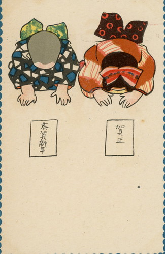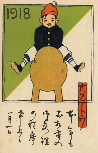 さまざまなテイストで描かれた馬のイラストのほか、子どもの日常生活や遊びをモチーフにした年賀絵はがきが目を引きます。干支にちなんだ意匠には馬の背に乗った子、竹馬で遊ぶ子、中には器械体操の“あん馬”に挑戦している男の子まで。馬や日本の子どもたちと戯れている、さまざまな装いのキューピーにもぜひご注目を。“カカア天下”な夫婦を面白おかしく描写した風刺画シリーズなど、ユーモアにあふれた漫画タッチの年賀状もご紹介しています。