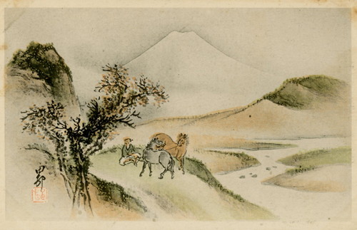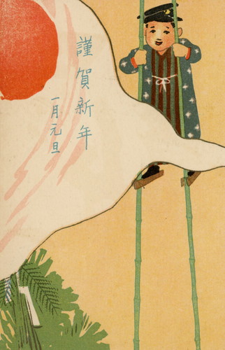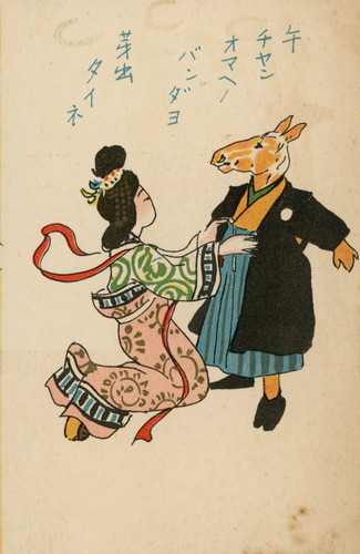 さまざまなテイストで描かれた馬のイラストのほか、子どもの日常生活や遊びをモチーフにした年賀絵はがきが目を引きます。干支にちなんだ意匠には馬の背に乗った子、竹馬で遊ぶ子、中には器械体操の“あん馬”に挑戦している男の子まで。馬や日本の子どもたちと戯れている、さまざまな装いのキューピーにもぜひご注目を。“カカア天下”な夫婦を面白おかしく描写した風刺画シリーズなど、ユーモアにあふれた漫画タッチの年賀状もご紹介しています。