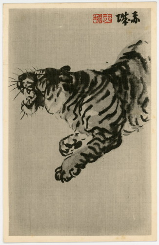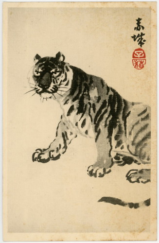 明治末期から大正期には、社会を滑稽に風刺した漫画雑誌が評判をとり、描かれる対象や意匠化のアイデアも非常に多彩。日本初の職業漫画家・北沢楽天が活躍し、彼の創刊したカラー漫画雑誌も人気を博しました。虎のイラストにも、ユーモラスな表情を戯画タッチで描き出したものが目立つようになります。
