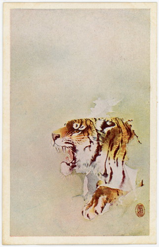明治末期から大正期には、社会を滑稽に風刺した漫画雑誌が評判をとり、描かれる対象や意匠化のアイデアも非常に多彩。日本初の職業漫画家・北沢楽天が活躍し、彼の創刊したカラー漫画雑誌も人気を博しました。虎のイラストにも、ユーモラスな表情を戯画タッチで描き出したものが目立つようになります。